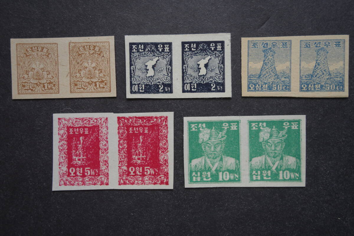- 外国切手: 韓国切手 「第1次普通切手」(無目打ペア) 5種完 未使用