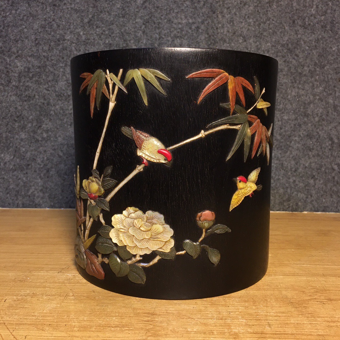 - 【超珍館蔵】紫檀木製 細密彫 百寶嵌 花鳥紋 筆筒 置物 賞物 古賞物 古美術品 稀少珍蔵品