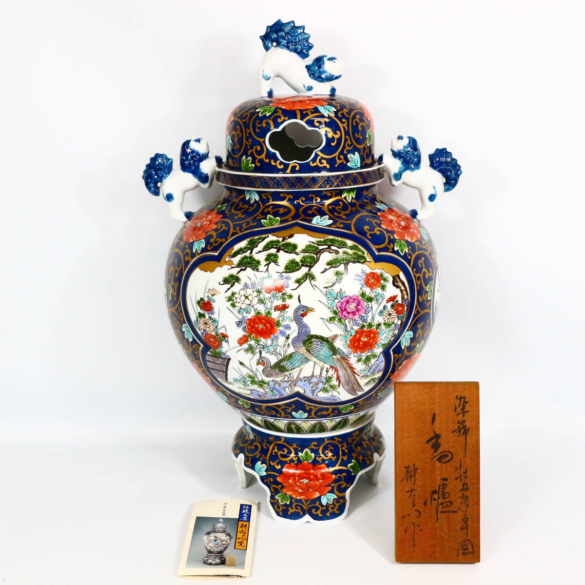 - 耕右衛門 飾り壷 染錦 花鳥図 香炉 沈香壷 飾壷 大花瓶 松梅牡丹唐草文 美術有田焼 色絵 飾り壺