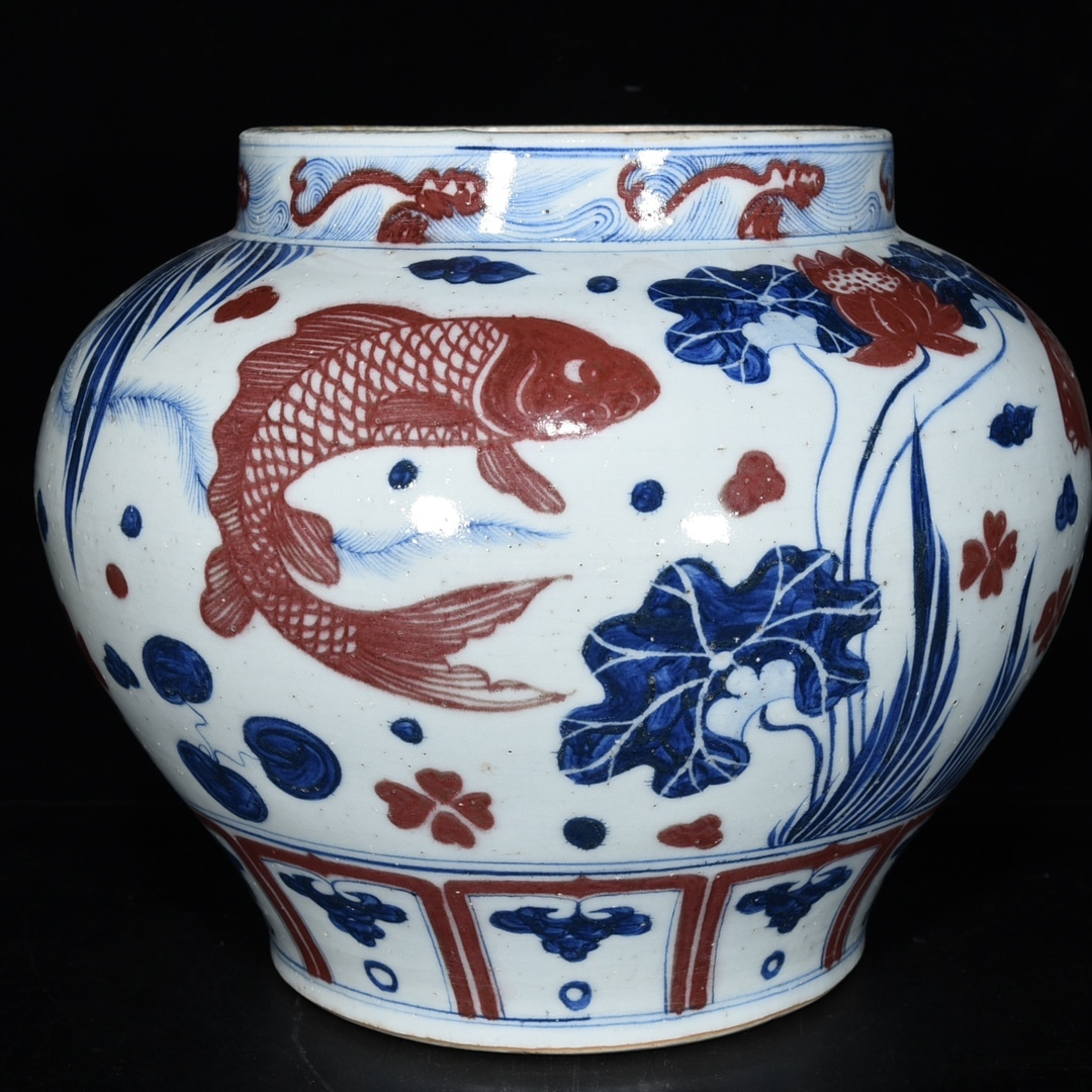 - ◆旧家蔵出◆古美術 中国古玩 元時代 青花 釉里紅 荷叶魚藻紋罐 細密細工造 置物 擺件 古賞物 骨董 時代物 AT08