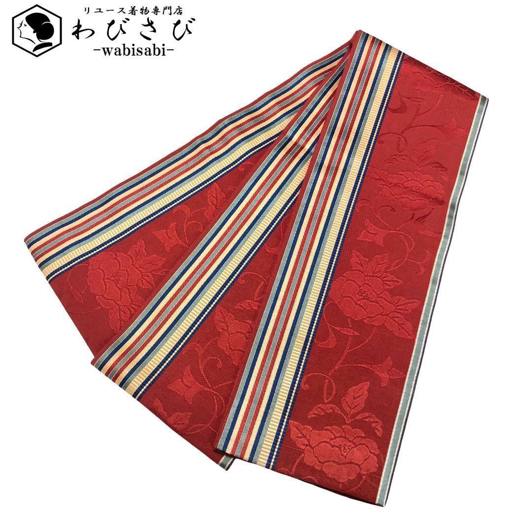 - 半幅帯 本場筑前博多織 証紙付 縦縞に花柄模様 蘇芳色 D-2057 着物 きもの kimono 和服 和装 中古 リサイクル着物 【送料無料】