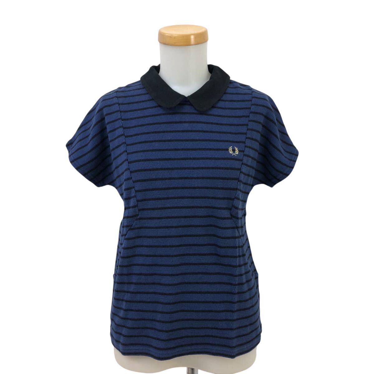 > Nm304-74 FRED PERRY フレッドペリー ボーダー柄 襟付き 半袖 コットン ニット ニットソー トップス ブルー系 レディース M 日本製