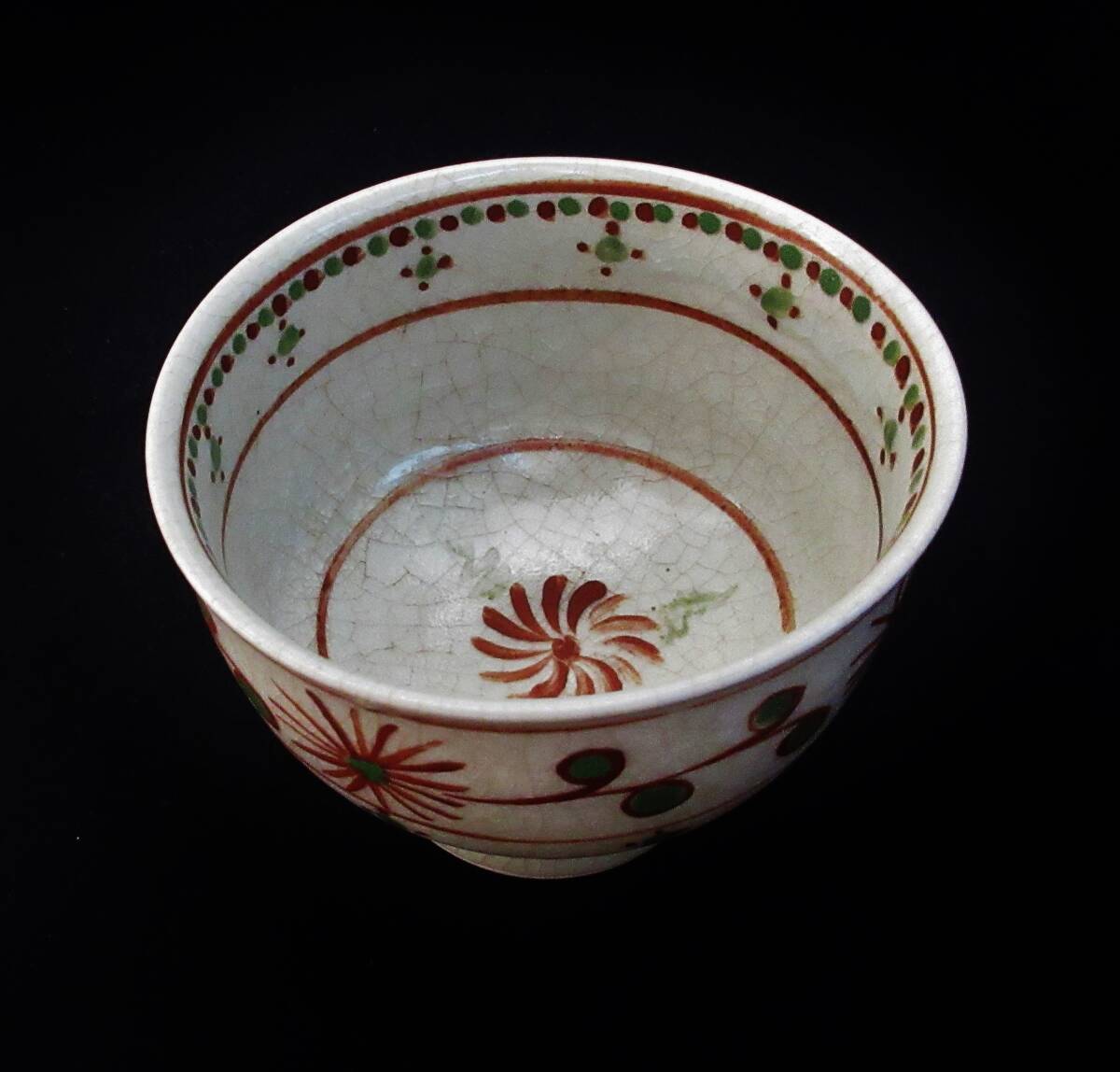- 時代茶道具【紅安南草花文茶碗】見込擦れ,歪み,高台キズ有り 箱無し