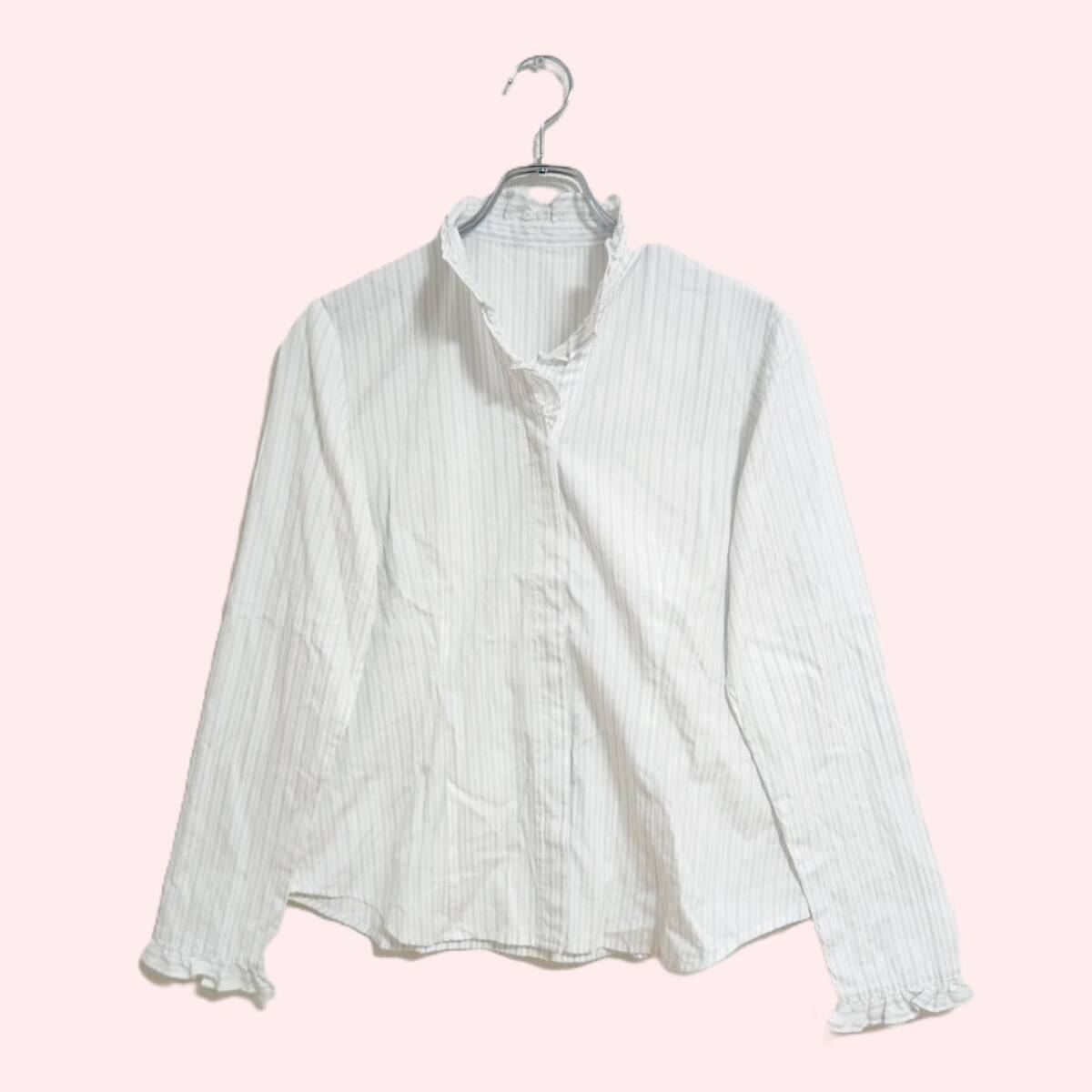 - 長袖シャツ フリル 白 M ストライプ 綿 薄手 爽やか 春夏 カジュアル 外出