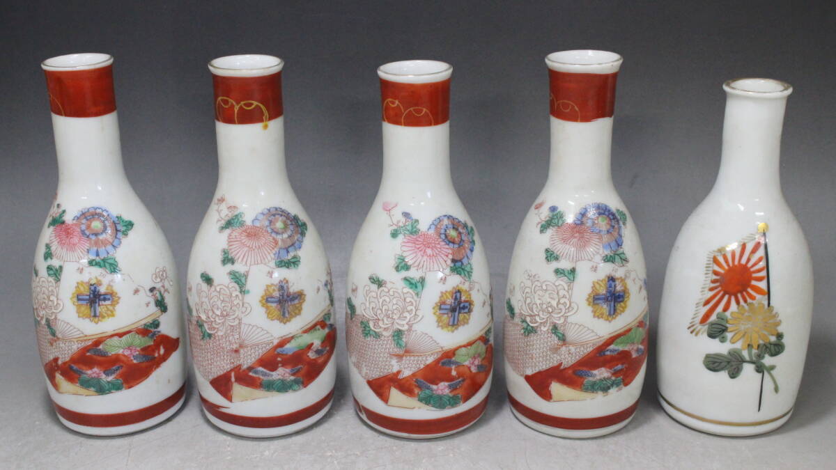 - 【文明館】九谷焼 色絵 徳利 2種5客 日本 時代物 陶磁器 ※未清掃品 ス87