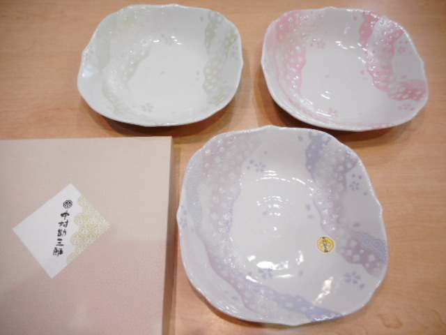 - ◇中村勘三郎 華化粧 三ッ組鉢 3枚セット 陶器 食器 鉢 花柄 パステルカラー かわいい 未使用 箱入り