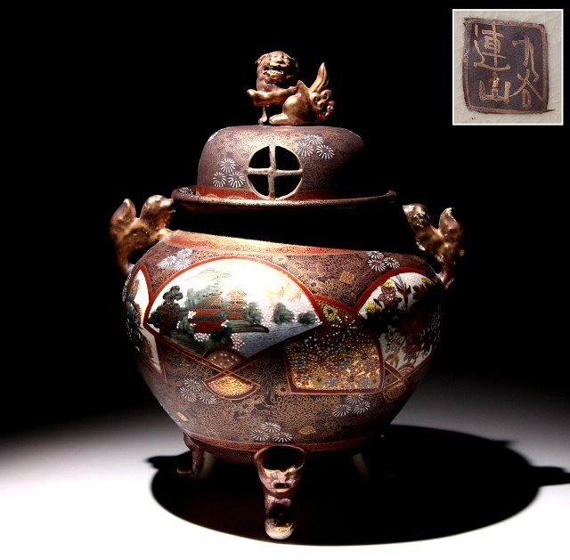 > ☆北斗☆九谷焼 九谷連山 金襴手扇面春秋山水草花図大香炉 高さ約36.5cm 獅子摘 獅双耳 三足 金彩 色絵 (検)大壷 飾壷 壺 陶器