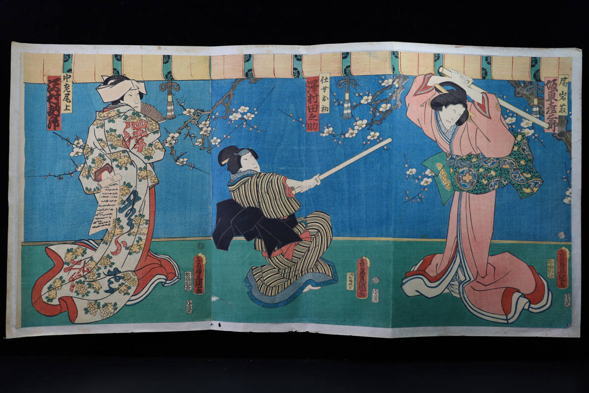 > ◇雅◇ 真作保証 歌川国貞 「佐野桂図 曽我古書染」 時代物 木版画 浮世絵 錦絵 役者絵 歌舞伎絵 3枚続揃い/MG.25.4 [I47.66] OXXX66