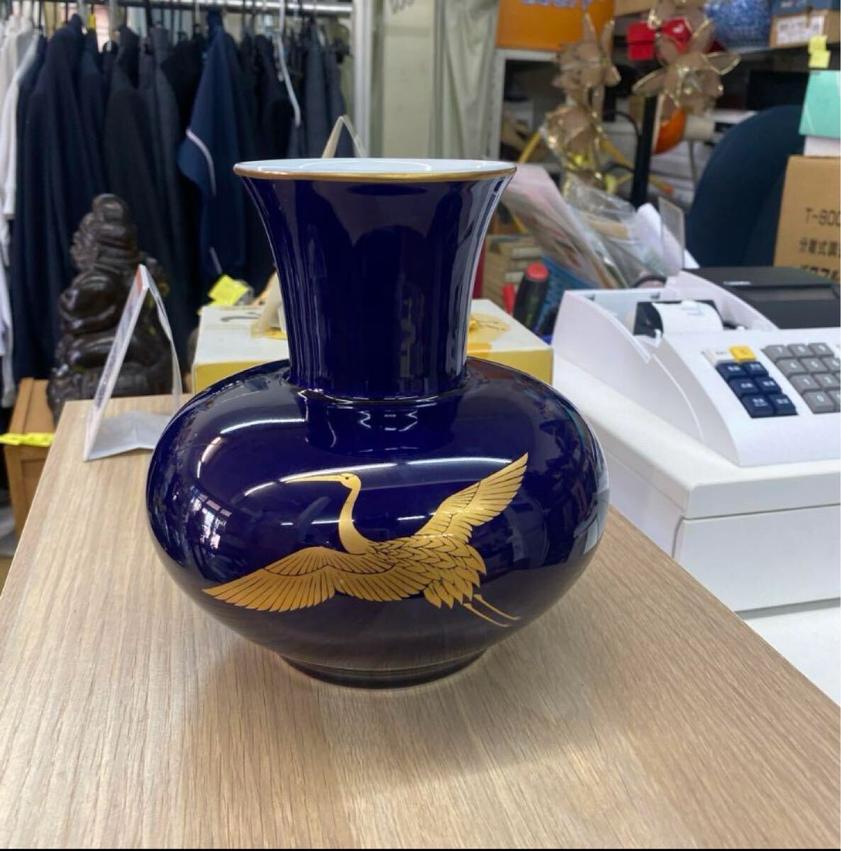 - 有田焼 香蘭社 金銀鶴絵 瑠璃色花瓶 花器 フラワーベース