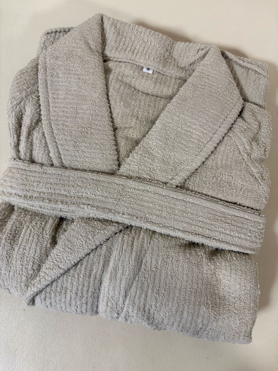 - 今治タオル 【新品】ボーダー織柄バスローブ(ベージュボーダー)フリーサイS男女兼用