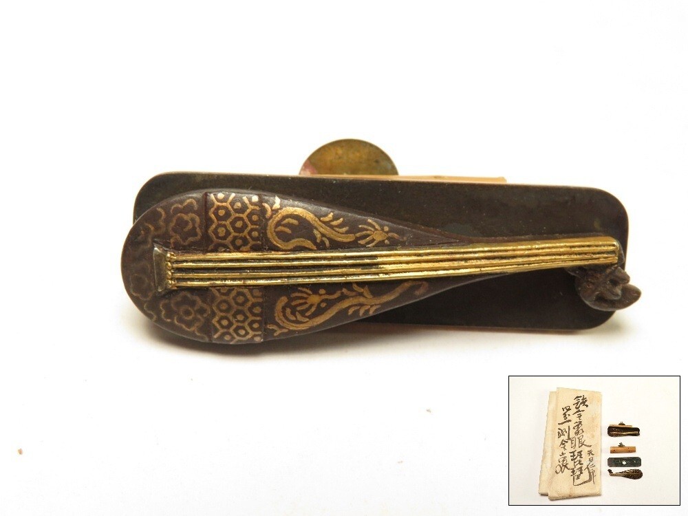 - 【10199】江戸~明治 堤物 金具 鉄地 象嵌 琵琶 重量26g(初品・買取品)