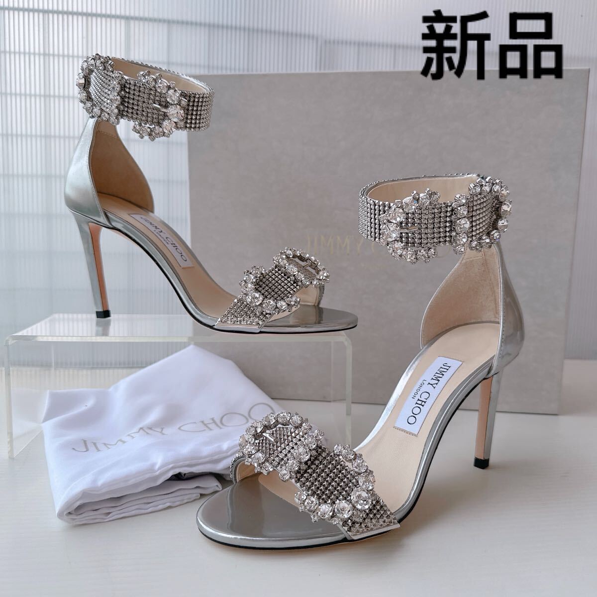 - 新品 JIMMY CHOO ジミーチュウ 豪華 クリスタル ビジュー ストラップ ラインストーン装飾 サンダル ハイヒール パンプス 37 靴 イタリア製