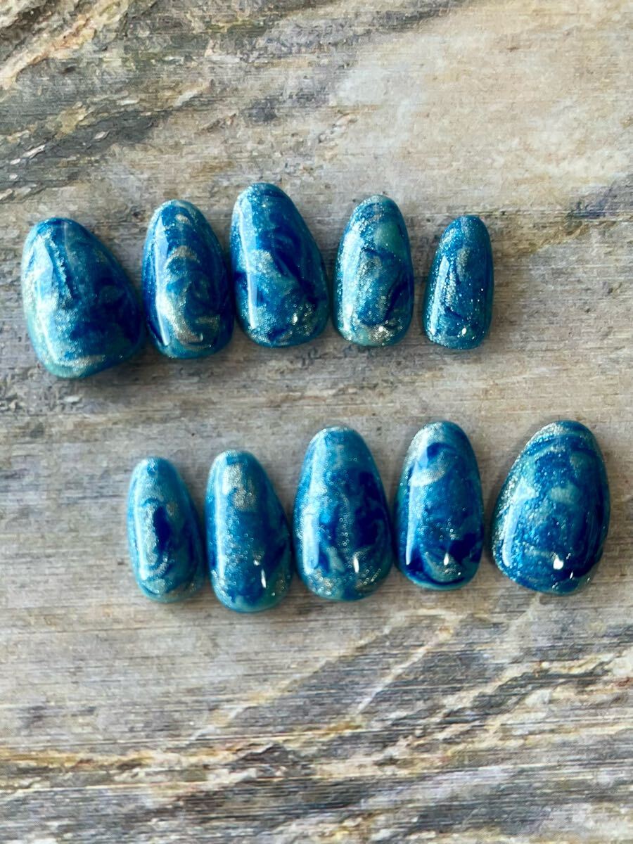 - ハンドメイド ネイルチップ ショートアーモンド ブルー シルバー マーブル