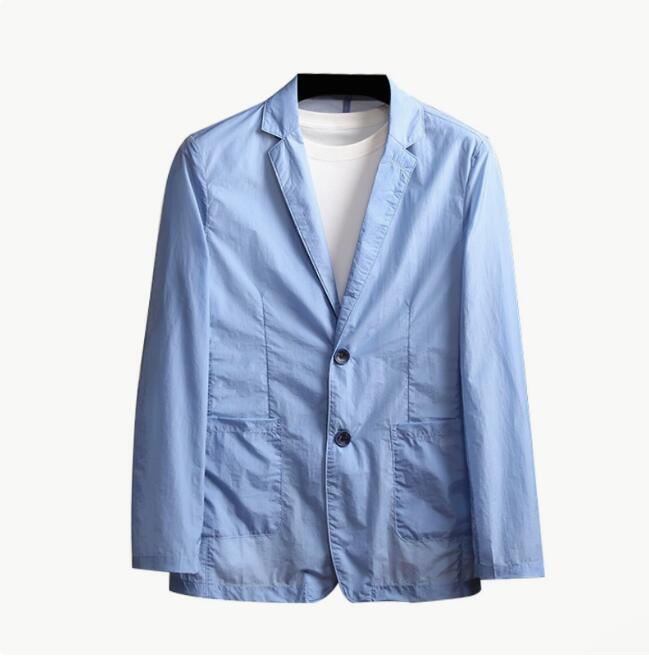 - L上質シボ加工 テーラードジャケット メンズ 夏用ブレザー 薄手 軽量 撥水 シースルー ライトアウター サマージャケットブルー