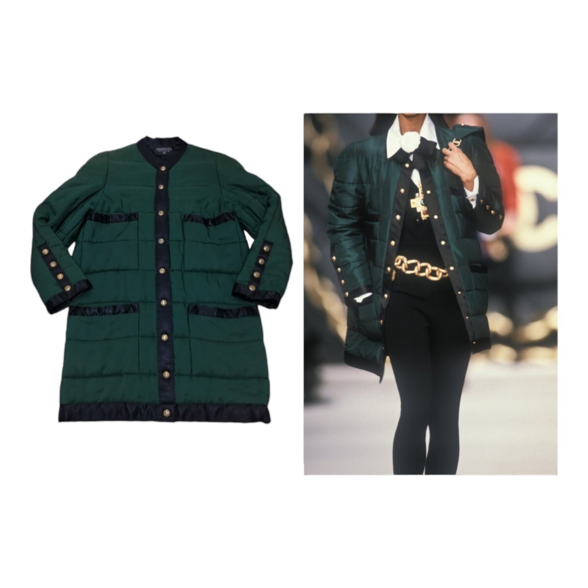 > レア vintage CHANEL 90s 1990 ノーカラー 中綿 ロング コート puffer jacket ジャケット ココマーク 金 ボタン 17個 CC logo 緑 黒 ダウン