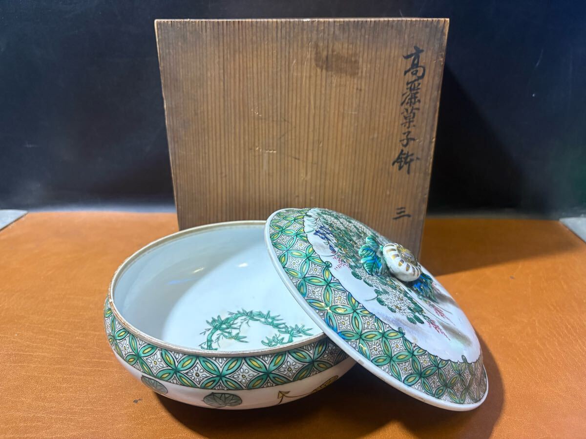 > 【保管品】九谷焼 染付 陶器 菓子鉢 約φ18×10cm 花つまみ 桐箱 古い 詳細不明 【管B807-2505】