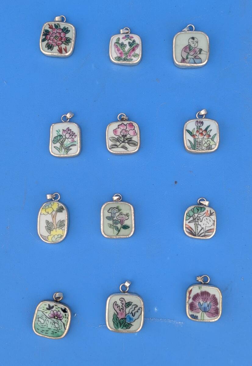 手作りペンダントトップ12個 絵を描いた陶器をぶら下げる金具を取り付け加工しています送料全国一律ゆうメール215円