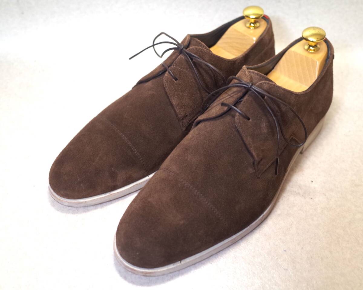 トゥにキャップトゥスタイルの飾りステッチが施された外羽根2アイレット スエードレザーシューズ。