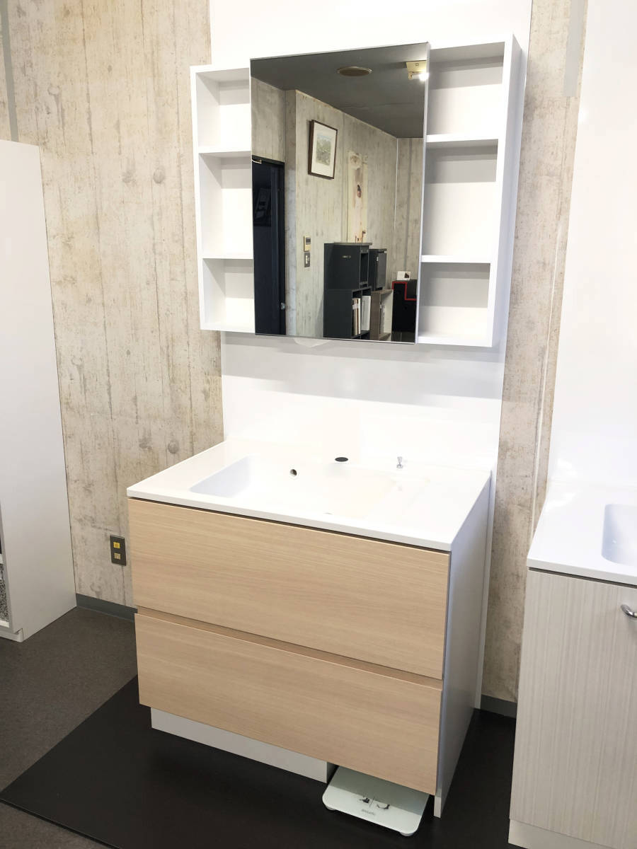 - ★新品未使用!★90cmオーダー洗面化粧台(モードオーク色扉/人大一体ボール/引出し/上下set)定価268,000円※水栓は無しです。