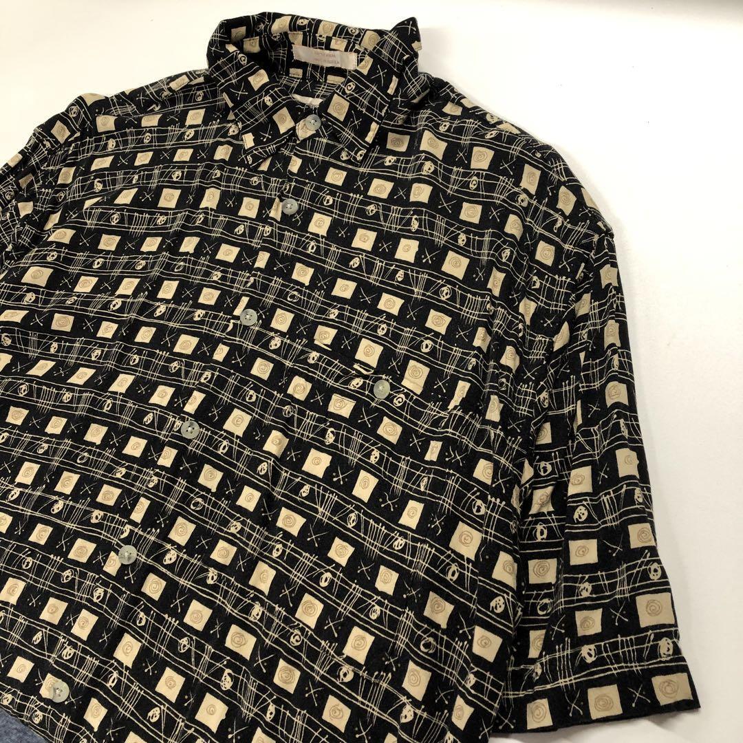 - 総柄 レーヨンシャツ 半袖 ブラック メンズM