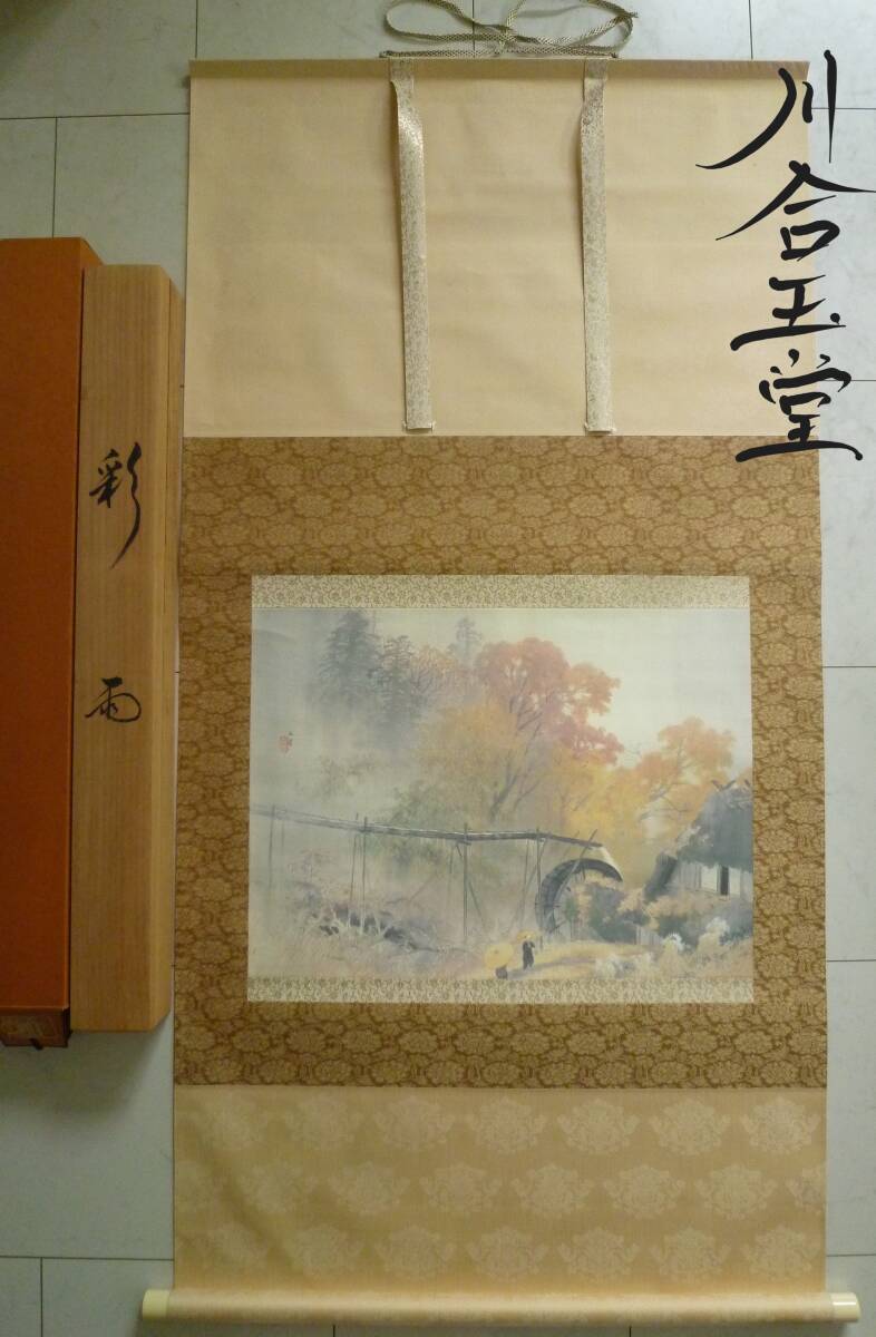 - 未飾品 特選 最高級品/川合玉堂/彩雨/東京書芸館/山水水車図/絹本/桐共箱付/布袋屋掛軸 複製 著作権使用承認済証 553000円