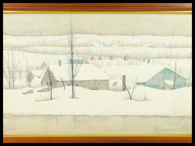 > 福井良之助 雪の朝(雪景色 風景画)木版画(孔版画)額装 1977年 専用タトウ 芸艸堂 師 島野重之 検 福井良佑 s25032309