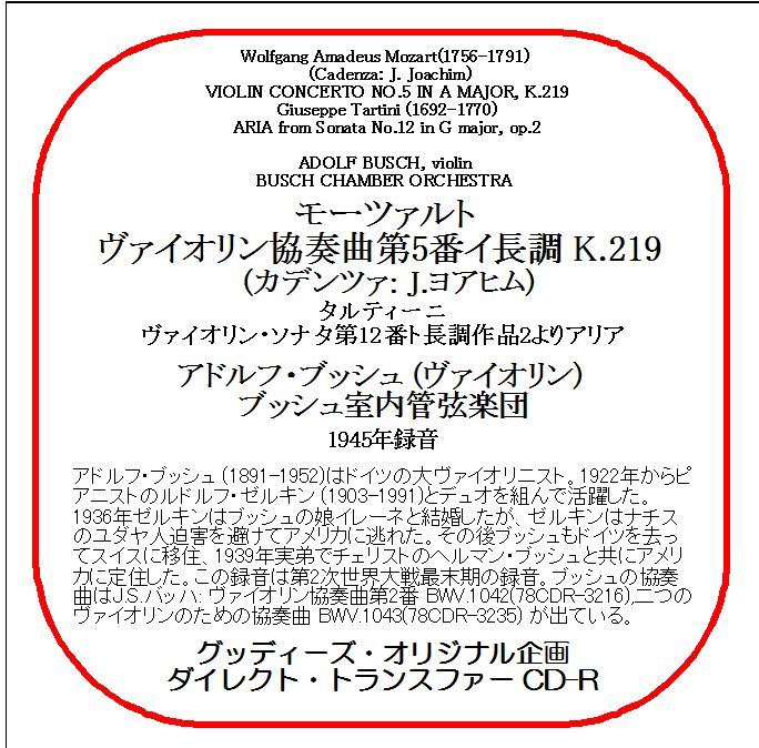 - モーツァルト:ヴァイオリン協奏曲第5番/アドルフ・ブッシュ/送料無料/ダイレクト・トランスファー CD-R