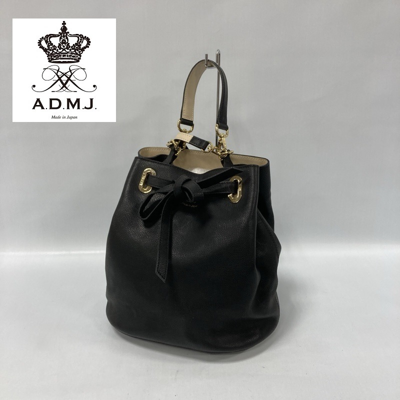 - A.D.M.J./エーディーエムジェイ/2WAY/巾着型/レザーショルダー・ハンドバッグ/オリジナルチェック柄裏地/バケットバッグ/クラウンロゴ