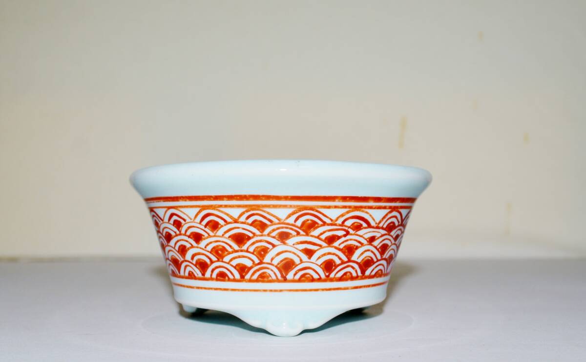 - 特注品・希少・伊藤月香の弟さん 「伊藤屯洋」 青磁釉 吉祥図赤絵青海波図 雲足外縁丸形の鉢
