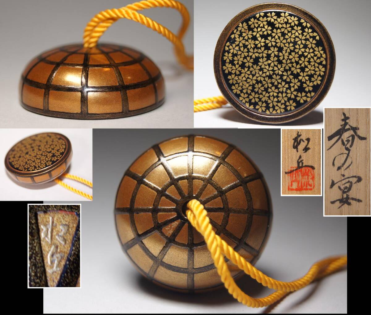 > 蒔絵師■白井松丘 作■ 蒔絵『春の宴』根付 共箱 桜 花籠 京都市生 漆器 漆芸 真贋保証 / 印籠 提げ物 煙草入れ 煙管