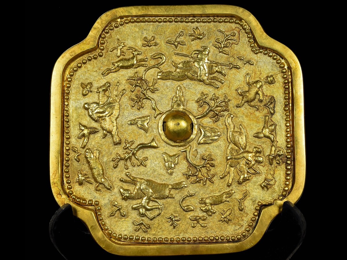 - 「唐代 古銅彫 塗金狩猟紋 銅鏡」旧銅器 置物擺件 賞物 中国古美術 旧蔵出