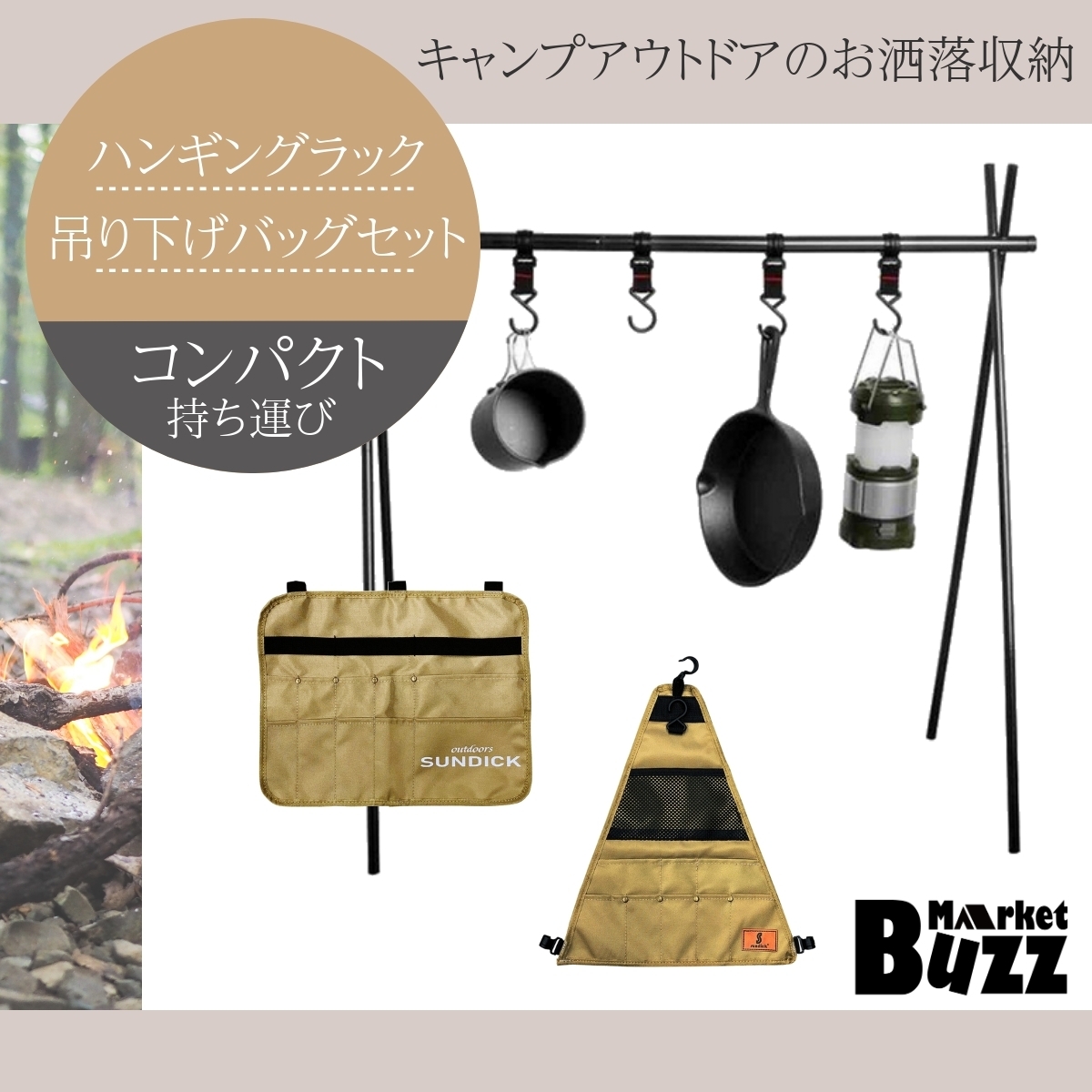> アウトドアハンガーラック & 吊り下げ型 収納バッグ 三角 & 収納バッグ四角 3点セット 登山 キャンプ ハイキング アウトドア に