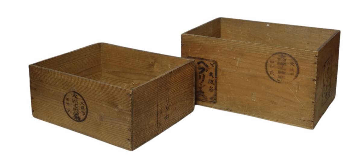 - 明治〜大正期ビンテージ 当時物 商標刻印入り商用木箱 2個セット 大阪市 ヘブリン丸 大学目薬 店舗什器 古道具 KSN705