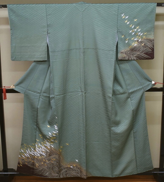 - A41-18【凛々】即決 中古品 ポリエステル 訪問着 緑 鶴 身丈161