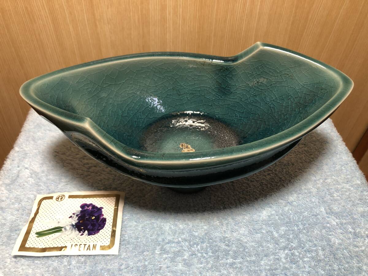 - 【送料無料】生け花花器 水盤 花瓶 フラワーベース いけばな 華道 陶器 青緑 変形型 伊勢丹 ISETAN 昭和レトロ ヴィンテージ 個人宅保管品