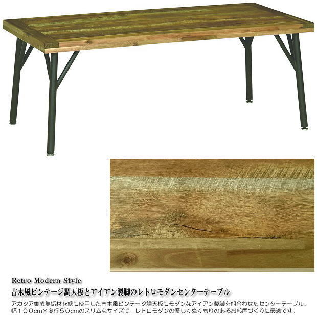 - 古木風ビンテージ調天板とアイアン製脚の100cm幅レトロモダンセンターテーブル 2人掛用 木製 スチール シンプル レトロ ブラウン ブラック