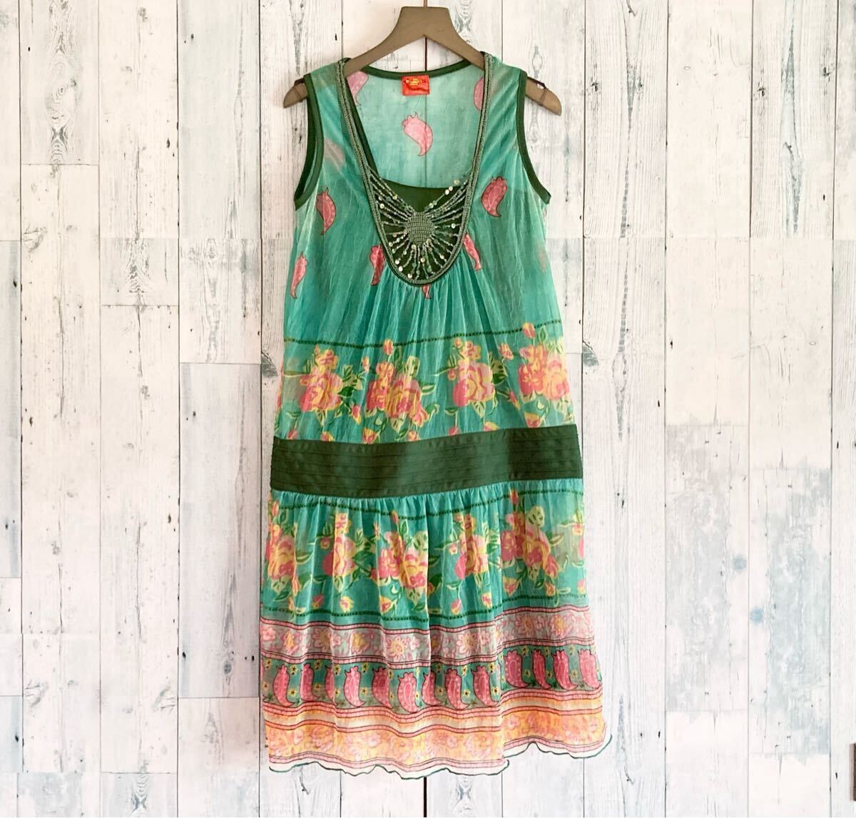 - ◆美品◆ エスニック スパンコール ノースリーブ 切替 シフォン チュニック ワンピース ペイズリー 花柄 グリーン レディース フリーサイズ