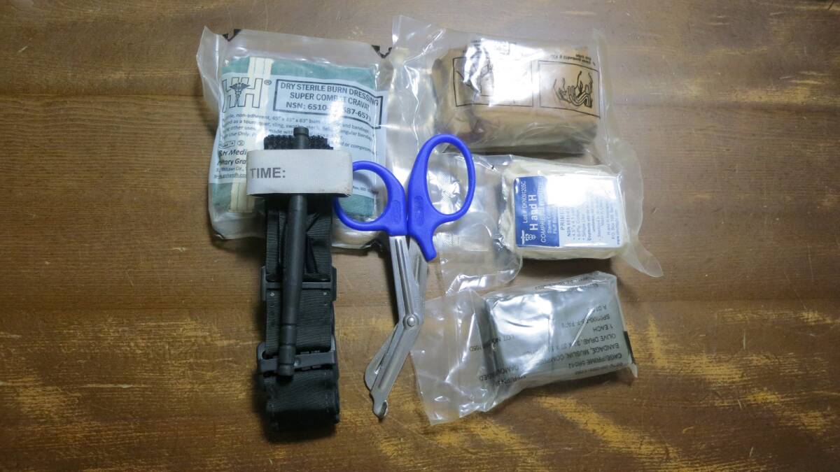 - 米軍放出品 実物 FIRST AID (圧縮包帯、ガーゼ)止血帯、ハサミ 6点セツト D-191