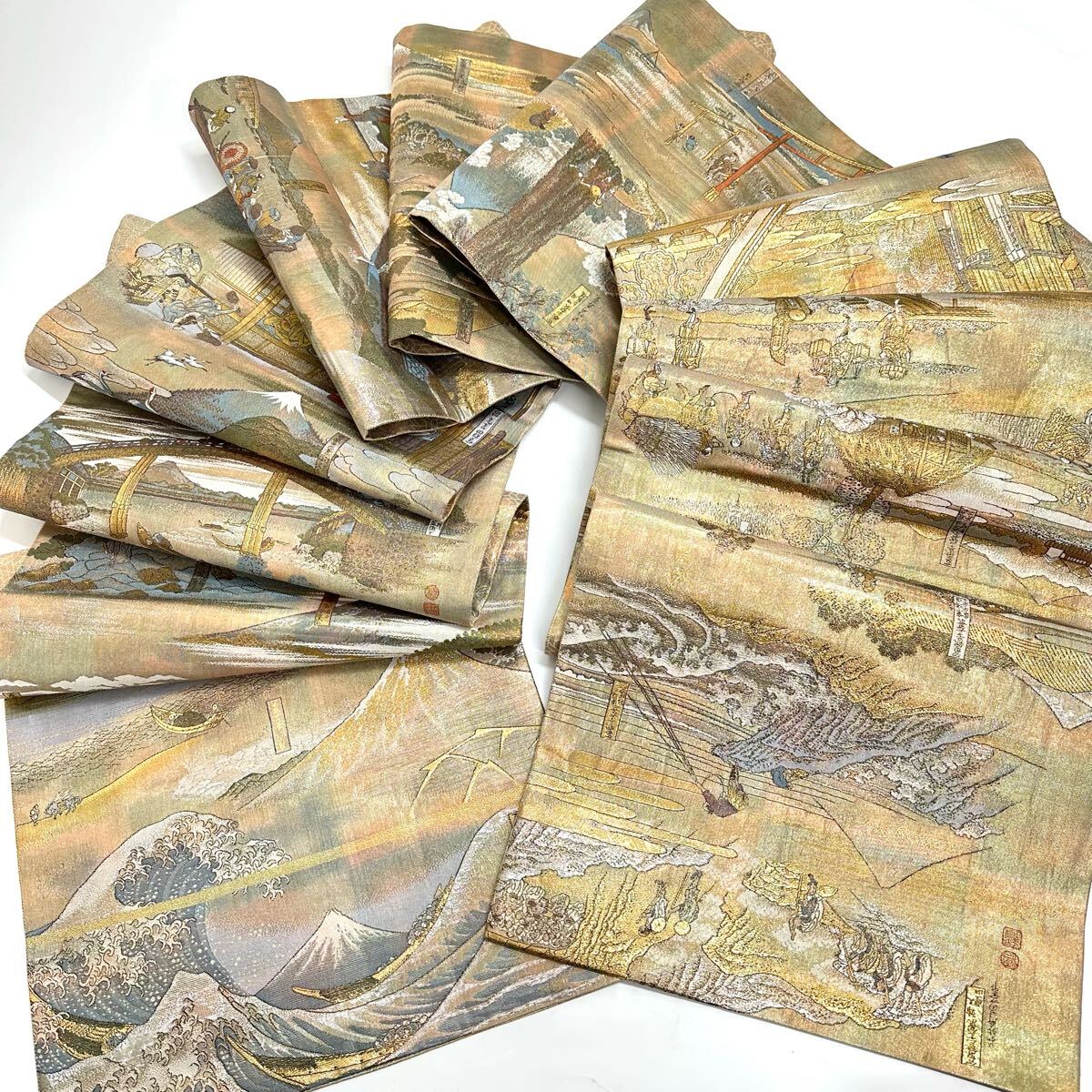 - 【七福】c568 逸品 高級品 正絹 袋帯 全通 北斎 富嶽三十六景 全通全景図 24金プラチナ二重箔 葛飾北斎 金糸 プラチナ糸 豪華
