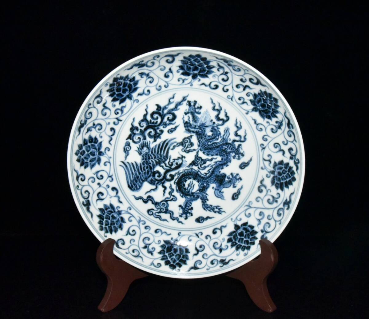 - 【超珍館蔵】明 宣德年製款 古陶瓷品 青花 龍鳳紋 供盤 陶藝 古賞物 古董品 古美術品 時代物 旧家蔵出 稀少珍蔵品