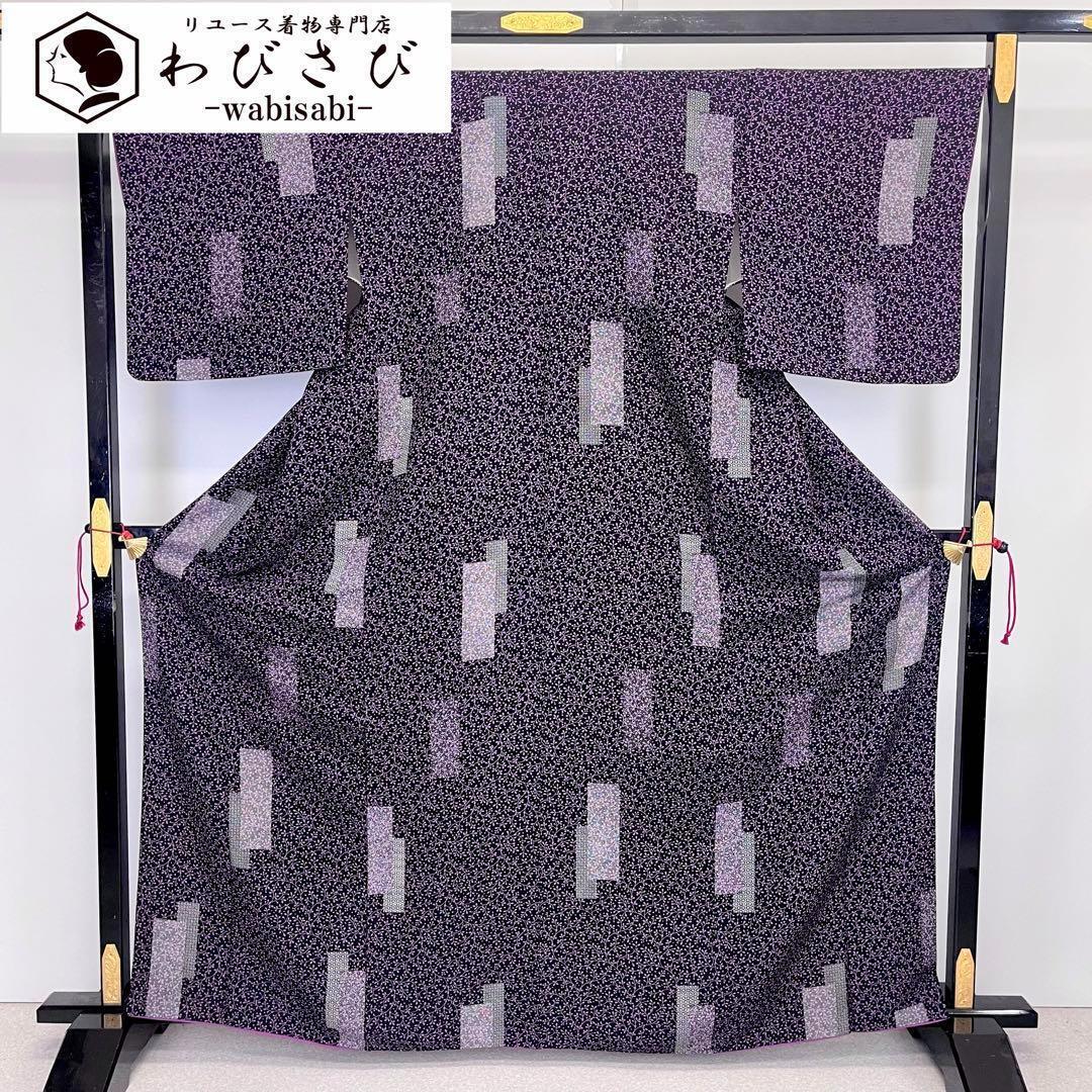 > 小紋 林信二 蔓草模様 縦柄四角に花亀甲 濃紫色 縮緬 K-3854 着物 きもの kimono 和服 和装 中古 リサイクル着物 【送料無料】