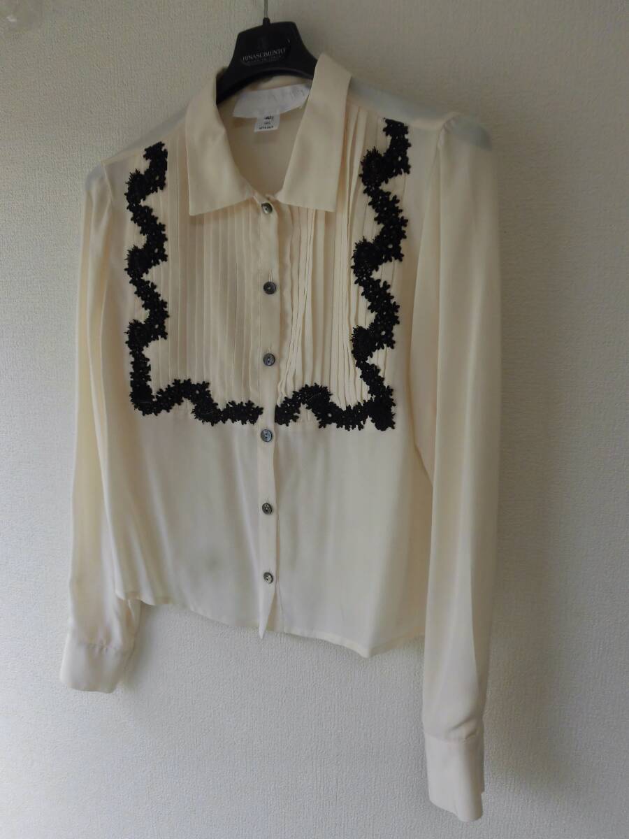 - ●GRAZIA FAVA イタリー製/黒レースプリーツ飾/アイボリーシルクシャツブラウス/サイズ40/~L相当