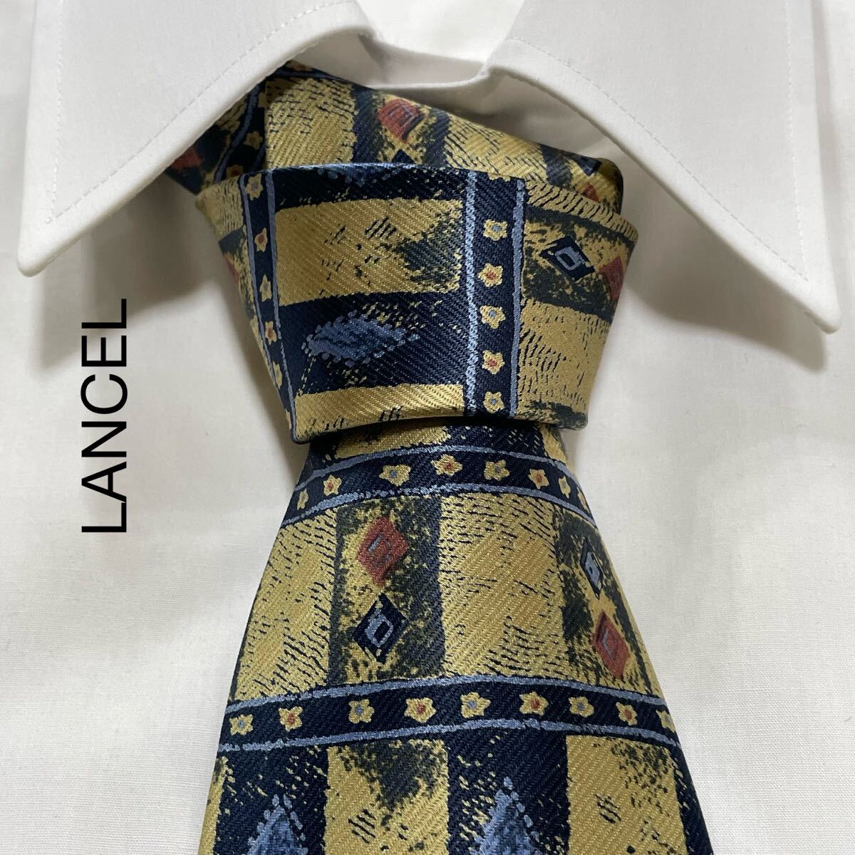 - LANCEL ランセル パターン柄 デザイン シルク ネクタイ 日本製 ゴールド ネイビー ブルー テラコッタ TG1621