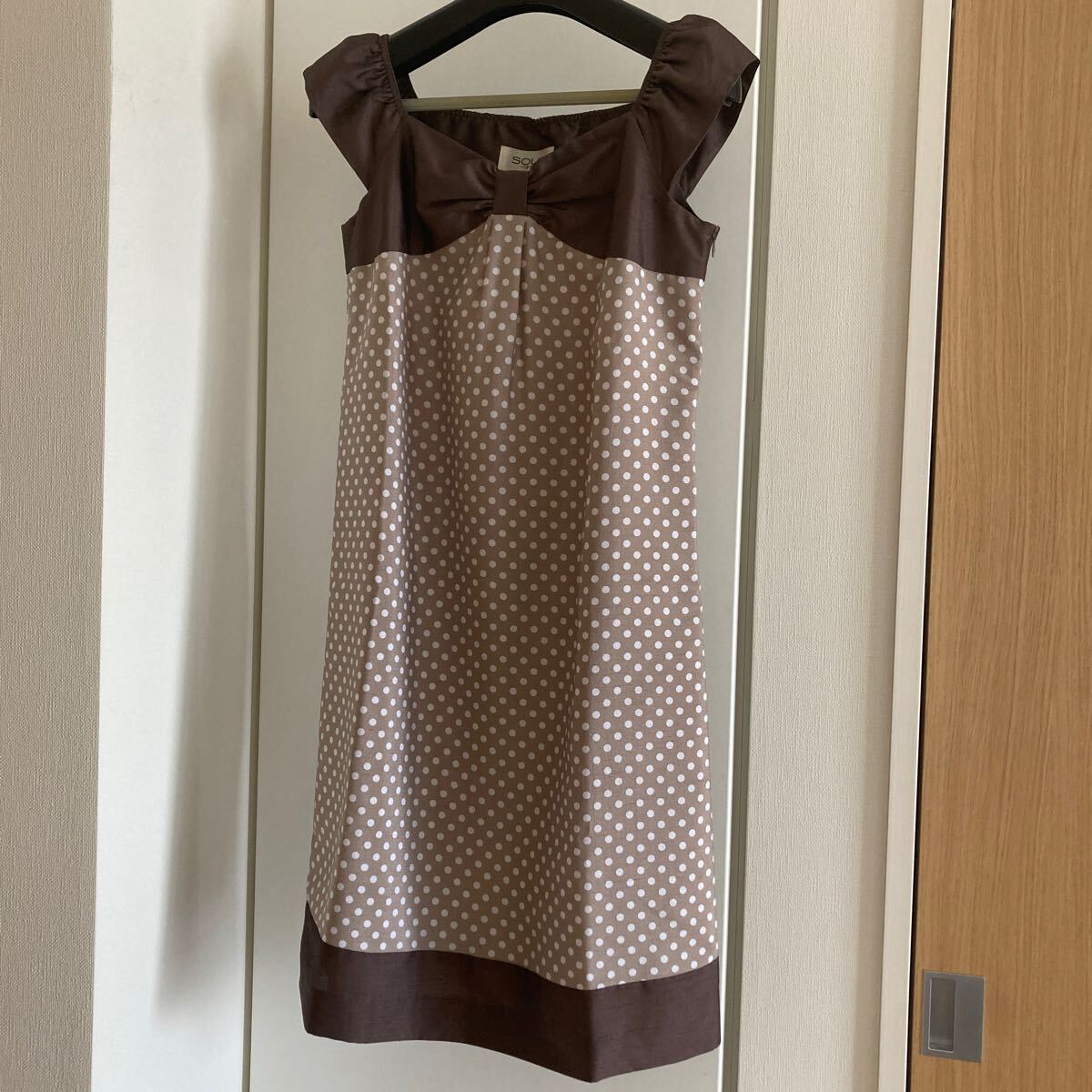 - ワンピース M ドット 茶 ベージュ フレンチスリーブ soup 9号