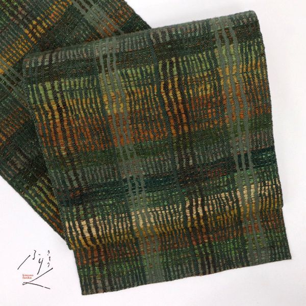 - 【名古屋帯】 紬 ざっくり格子チェック柄 深緑色 普段着に 正絹着物 NG3-1