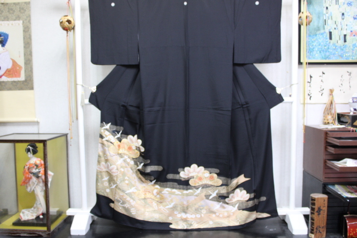 - きもの今昔8576 正絹黒留袖紋付 比翼付き 目出度い三階松に白鶴の柄 比翼地はポリエステル 身丈164cm