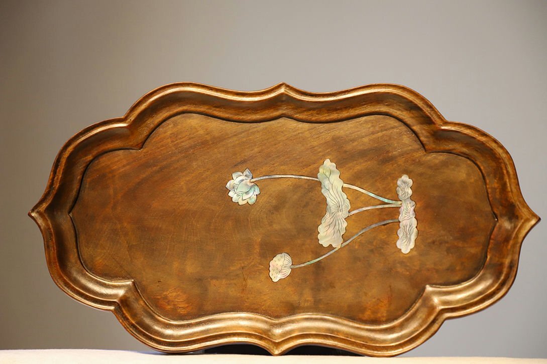 - ■観心・時代旧蔵■C0492清時代 黄花梨嵌螺鈿葵口茶盤 黄花梨木細密彫 細密細工★古置物★古賞物★古擺件★蒐集家放出★唐物