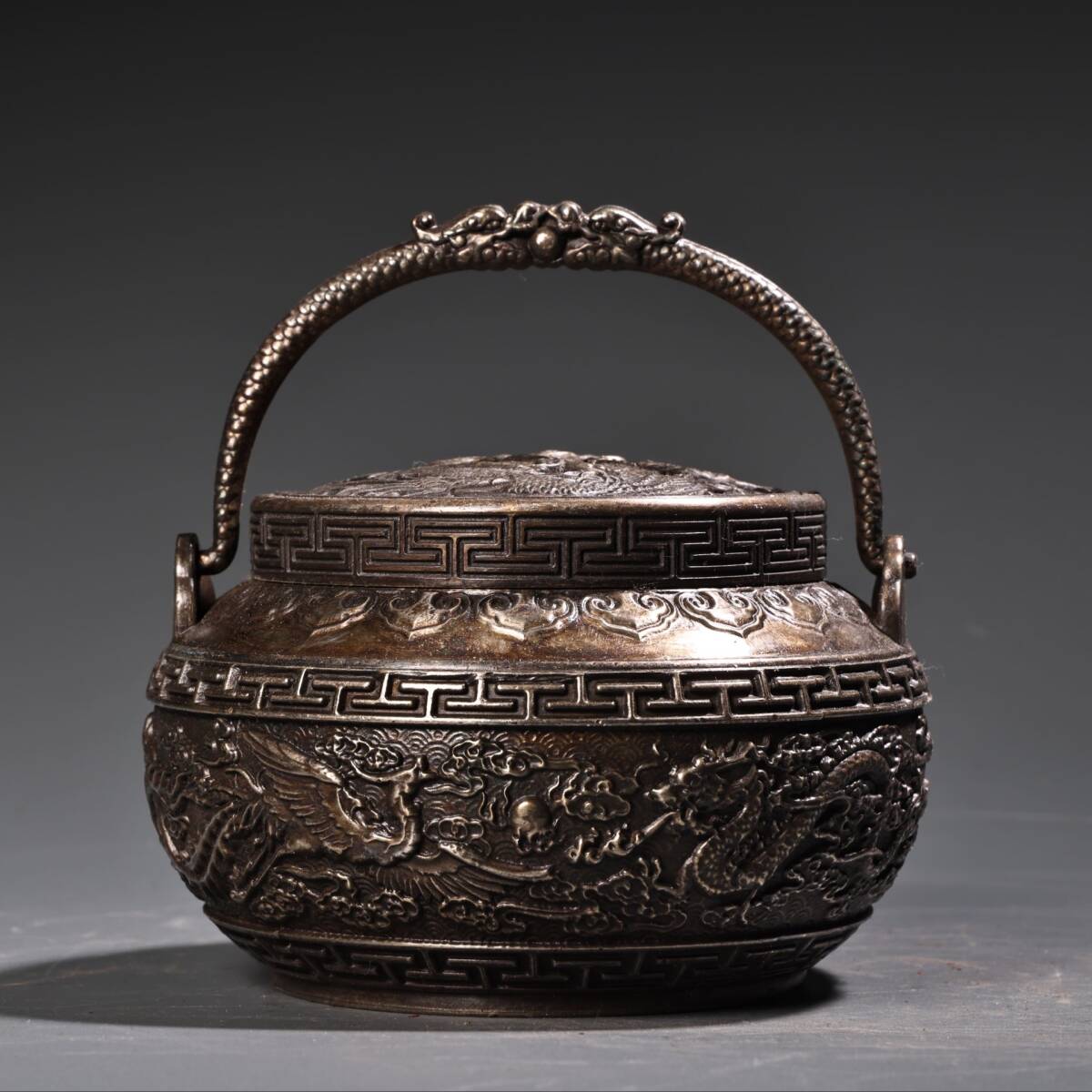 - 【仁】『銅製・銀鍍・龍鳳紋・提梁熏香炉・置物・賞物』極細工 古董品 中国古玩 古美術 古美味 時代物 旧家蔵出