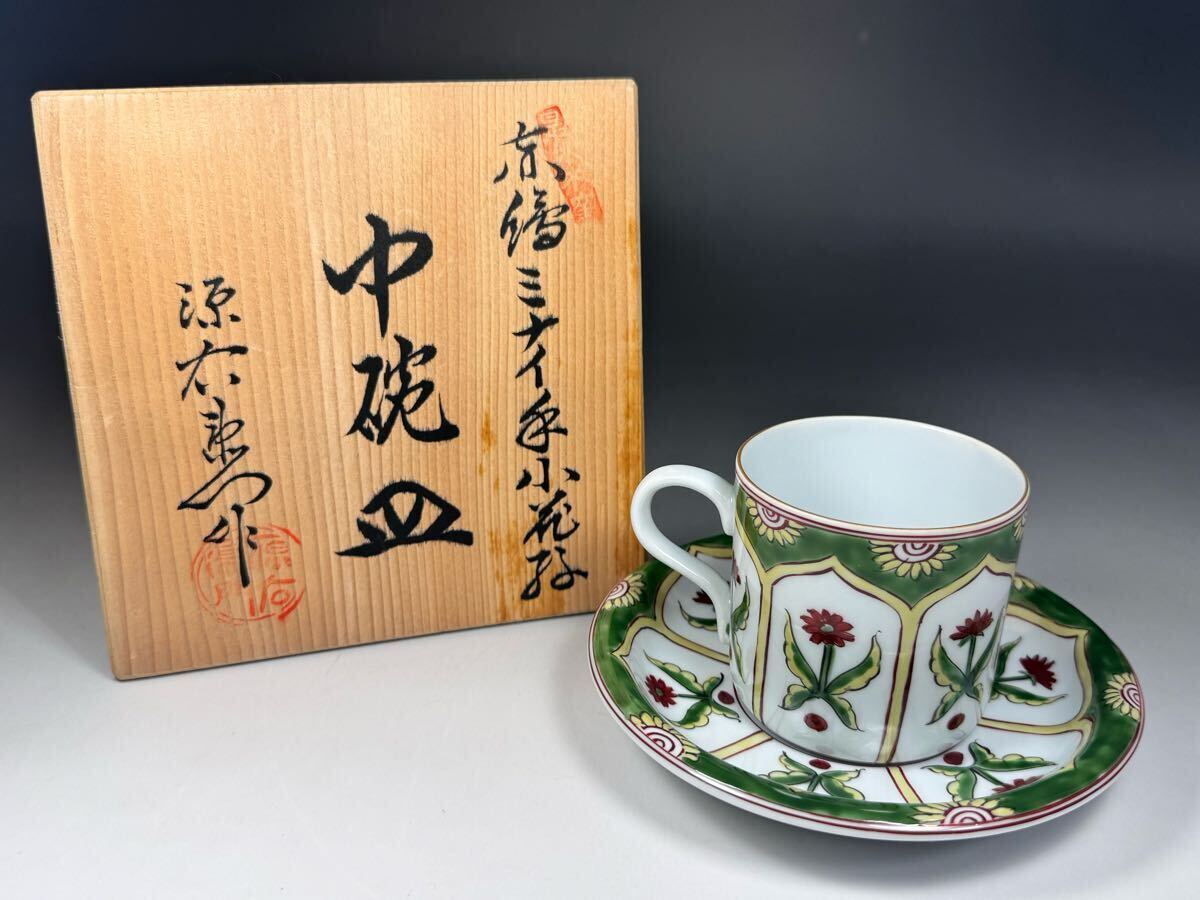 > 源右衛門 作 赤絵ミナイ手小花絵 中碗皿 共箱 珈琲碗 カップ ソーサー 有田焼