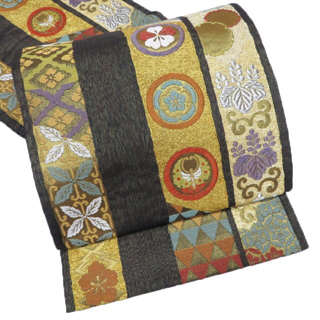 > 袋帯 中古 リサイクル 正絹 フォーマル 仕立て上がり 六通 縦段模様 有職文様 箔糸 黒色 多色 金 きもの北條 A1206-15